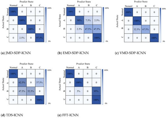 Furthermore, Figure 9 depicts the confusion matrices for these five methods, which illustrate the performance of the methods for classifying motor fault states. The vertical axis delineates the actual labels associated with the test set samples, and the horizontal axis indicates the labels predicted by the model. The figures reveal that the JMD-SDP-ICNN method can completely classify the normal, A, and B fault states into their respective categories, and the identification of the C fault state also achieves a high accuracy rate. Additionally, the EMD-SDP-ICNN approach exhibits a significantly low recognition accuracy of only 47.5% for fault state B, which misclassifies a significant number of shaft bends as commutator wear. In contrast, the VMD-SDP-ICNN approach misclassifies a certain amount of shaft bends as commutator wear. For TDS-ICNN, the confusion between fault states A and B is very serious because the input signal is not processed. However, FFT-ICNN fails to identify fault state B. Compared with other methods, the proposed JMD-SDP-CNN method achieved superior accuracy and a better diagnostic effect in diagnosing fault types and missing faults.