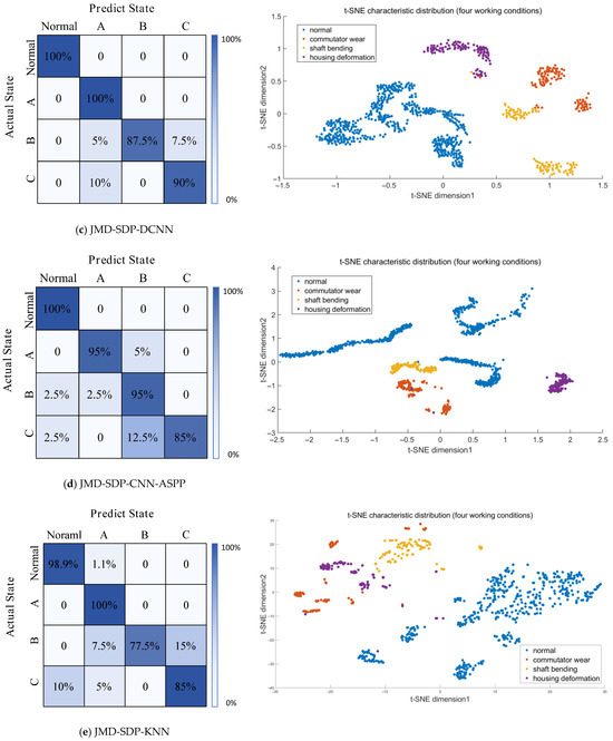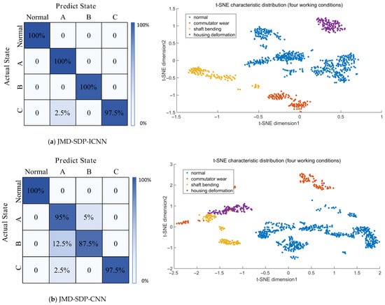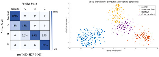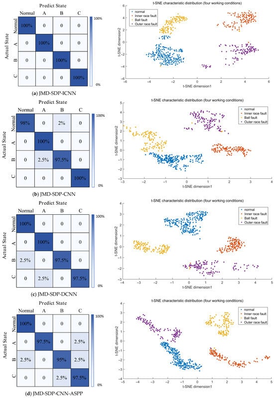The confusion matrices identified by different models for the four working conditions and the t-SNE plot are shown in Figure 10. As can be seen in this figure, JMD-SDP-ICNN has high accuracy in the recognition of four working conditions, and the distribution boundaries of features in different working conditions are clear, which is significantly better than other models.