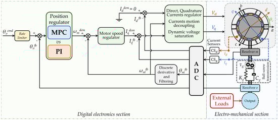 - Sensor processing: The rotor and output shaft positions are measured through resolver angular sensors, while the d–q currents are acquired with Hall effect current sensors. In the real EMA, each motor phase current is measured, and then the d–q currents are calculated in the digital control section via Clarke–Park transformation (7).