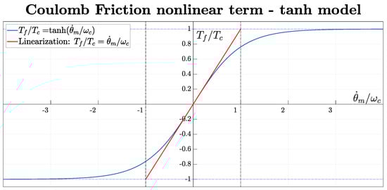 Vd, Vq and Id, Iq are, respectively, the direct and quadrature voltages and currents. Lph and Rph are the motor phase inductance and resistance, nd is the number of pole pairs, and Ke is the back-electromotive force constant of the PMSM. θm and θo are, respectively, the angular positions of the motor and the output shaft, and Jm and Jo are the associated inertias. Kg and Cg represent the torsional stiffness and damping of the differential ball-screw drivetrain with gear ratio τg. The motor torque constant kt is equal to Ke for the S-PMSM. Bm is the viscous friction coefficient, while Tc and ωc are the parameters of the Coulomb–tanh friction model illustrated in Figure 3. The torque-induced drag is included through a scaling term proportional to the motor torque Tm, governed by the coefficient Kfl. Text is the external torque acting on the output shaft, accounting for load disturbances and aerodynamic actions. Finally, the parameter θfp defines the half-width of the free-play dead zone.