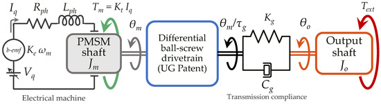 The electro-mechanical section includes three main dynamic contributions: the electric motor with d–q axes current dynamics (1), the rotor-side one-degree-of-freedom (DOF) rotational motion (2), and the output shaft with 1-DOF rotational dynamics (3). These equations are coupled through the compliant mechanical transmission, modeled with lumped spring–damper parameters, assuming low structural damping. Mechanical friction is modeled as lumped on the motor shaft and includes both viscous and Coulomb contributions [35]. A load-dependent friction term proportional to the motor torque is also included. Mechanical free-play nonlinearity is introduced into the transmission by means of a symmetric dead-zone model [36] acting on the relative angular displacement (4).