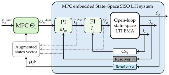 The first design decision involves choosing how to integrate the model predictive controller. Since classical EMA architectures consist of three nested loops, one option would be to replace all of them with a single MPC regulator. However, this strategy introduces significant challenges: internal saturation limits (e.g., maximum motor speed and current), typically enforced by external saturation blocks, must be explicitly addressed as hard constraints on system states, inputs, and outputs. This approach would require solving a constrained optimization problem with linear inequalities constraints. Although MPC algorithms can address this task using quadratic programming methods, such as Hildreth’s algorithm [40], the associated computational complexity and potential constraints conflicts make this solution unsuitable for safety-critical applications. Preliminary control laws design and further optimization of PI controllers highlighted a strong dependence of the EMA’s closed-loop performance on the tuning of the position regulator, while motor speed and current regulators have a secondary influence. Based on this evidence, the MPC was employed as the position regulator, in cascade with the optimized PI controllers for speed and current loops. Aerospace applications impose a trade-off between embedded model accuracy and necessary computational resources. Certification requirements in safety-critical systems limit the use of complex or unverified algorithms. Therefore, the embedded model must be kept as simple as possible while still capturing the essential EMA dynamics. To fulfil these requirements, the MPC was developed without internal constraints and based on a simplified LTI model. Specifically, since the MPC operates as a position regulator, its embedded model corresponds to the speed closed-loop EMA shown in Figure 6, represented by the transfer function (40) and discretized at a 10 kHz sampling rate. Referring to Figure 6, the open-loop model of the EMA corresponds to the five-states representation also used for PI optimization (Figure 4). The inclusion of current and speed loop integrators adds two additional states. An additional state results from the discrete-time derivative and filtering used in speed reconstruction, yielding a total of eight states (41). These additional states are not directly measurable but can be computed from the PI regulators’ internal variables and sensor processing at the previous time step. The output speed ωo is estimated using the same approach applied to calculate the motor speed from the position feedback.