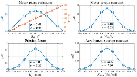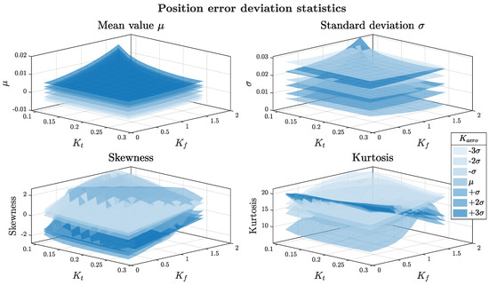 To better understand the interaction between uncertain parameters and their impact on control performance, the statistical metrics of the position error deviation were mapped over the kt − Kf plane and layered with Kaero values (Figure 21). The mean and standard deviation plots revealed a reduction in control effectiveness under conditions of low electro-mechanical coupling combined with high friction and external loads.