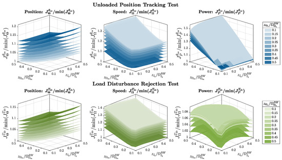 To facilitate further result interpretation and to clarify the adopted weight assignment convention, it is useful to group each pair of cost functions associated with a specific performance metric: position tracking (17), speed tracking (18), and power consumption (19).