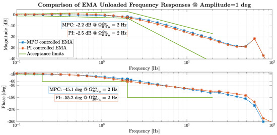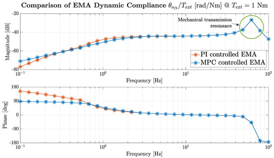 The Bode diagram of the EMA dynamic compliance, defined as the transfer function from external torque input to the angular displacement, is illustrated in Figure 15. Around the design bandwidth, the MPC achieved slightly greater load attenuation and a higher phase lead, enabling faster compensation of the disturbance. At low frequencies, PI outperformed MPC due to better phase anticipation. In the high frequency range, the responses of the two controllers converged, as the actuator resonance mode dominated the overall dynamics.
