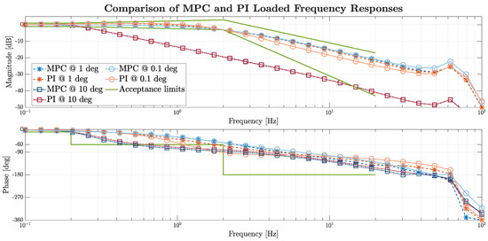 Figure 12 shows the loaded frequency response at increasing levels of command amplitude. At 0.1 deg, typical of aircraft stability augmentation functions, the PI controller suffered early gain attenuation and phase lag, while MPC maintained full sensitivity at small commands. At 1 deg, representative of typical autopilot commands, both controllers met the performance requirements. Under extreme maneuvers (10 deg), saturation effects caused both to exceed the acceptance limits.