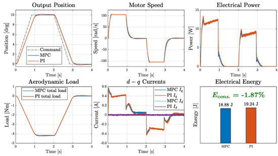 The response of the EMA to a step-like gust disturbance is shown in Figure 14. Despite a comparable peak in the output position, the MPC-controlled actuator returned to equilibrium significantly faster, demonstrating superior damping. This improved rejection capability was further confirmed by the motor speed and current profiles: while PI induced strong oscillations, the MPC ensured smoother transients. In addition, energy consumption was reduced by approximately 20%, highlighting MPC as a promising solution also for aircraft secondary control surfaces.