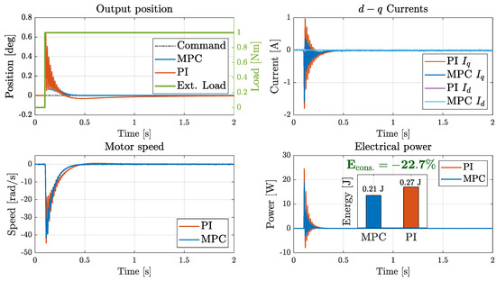 Uncertainty in the friction coefficients (Figure 18) introduced noticeable deviations, not only in the electrical but also in the mechanical responses. Deviations in the output position became significant, particularly for the PI controller, highlighting its higher sensitivity to friction-induced drag. The MPC controller, instead, exhibited improved consistency in position tracking and faster recovery following the disturbance, while showing reduced energy consumption, especially under severe parameter deviations.