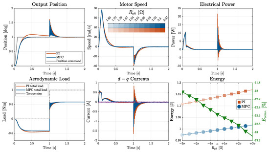 The time-domain responses of MPC- and PI-controlled EMAs under single-parameter variation are illustrated in Figure 16, Figure 17, Figure 18 and Figure 19. Figure 16 illustrates the effect of temperature-induced variation in the motor phase resistance. While the overall dynamic response remained robust for both controllers, the increased resistance led to higher Joule losses, which reflected directly in the power and energy consumption, with the MPC efficiency gain over the PI widening as temperature increased.