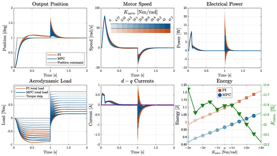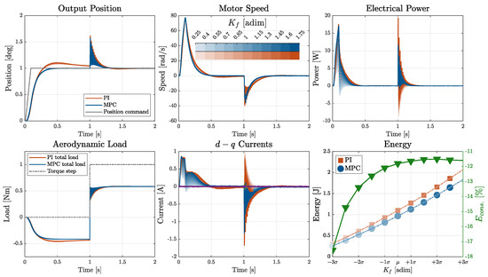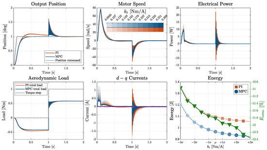 Considering the variation in the motor torque constant (Figure 17), both control strategies exhibited strong robustness in the output position response. However, significant sensitivity was observed in the electrical quantities. At lower values of the torque constant kt, a higher quadrature current is required to generate the same motor torque, resulting in increased power peaks in both systems. Nevertheless, in this extreme scenario, the relative energy saving achieved by the MPC strategy became even more evident, highlighting its superior efficiency.