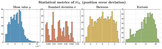 The second phase of the analysis focused on a detailed robustness characterization of the MPC with respect to combined variations in the most influential parameters, kt, Kf, and Kaero. Figure 20 shows the statistical distribution of the position error deviation across all Monte Carlo simulations, in terms of the mean, standard deviation, skewness, and kurtosis. The distribution of the mean value, centered near zero with a slight positive bias, indicated that the tracking performance was generally preserved. The standard deviation revealed a multi-modal profile, suggesting the presence of distinct sensitivity clusters due to the discrete influence of the Kaero. The skewness values were broadly distributed around zero, showing no dominant direction asymmetry. The high kurtosis observed across the dataset confirmed a leptokurtic distribution, characterized by a non-negligible occurrence of extreme outliers. These cases represented critical parameter combinations that led to significant deviations in tracking performance.