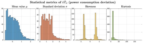 The power consumption deviation metrics are summarized in Figure 22. The distribution of the mean values was predominantly non-negative and slightly right-skewed, indicating that most uncertain configurations tended to increase average power consumption compared with the nominal scenario. Notably, a secondary mode with negative values emerged, suggesting that a subset of parameter combinations can also lead to net energy savings. This behavior aligned with the bimodal trend observed in the skewness plot. The heavy-tailed standard deviation suggested nonlinear amplification of power fluctuations under uncertainty. The kurtosis appeared strongly leptokurtic, with frequent extreme outliers. This reflected the system’s susceptibility to large energetic deviations under specific uncertainty conditions, in contrast with the more constrained behavior observed in the position error analysis.