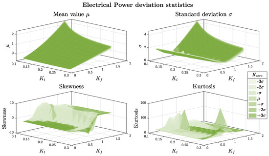 Figure 23 is useful for identifying specific regions where strong power performance degradation occurred. Similarly to the position trend, the mean and standard deviation increased significantly for low kt and high Kf, highlighting a critical region for EMA robustness. The skewness confirmed highly asymmetric and heavy-tailed behavior in the same region. Interestingly, the combined influence of extreme values of Kaero and kt appeared secondary in terms of means and standard deviations but had a significant impact on kurtosis, suggesting that certain parameter combinations might have amplified rare, yet extreme, power deviations.
