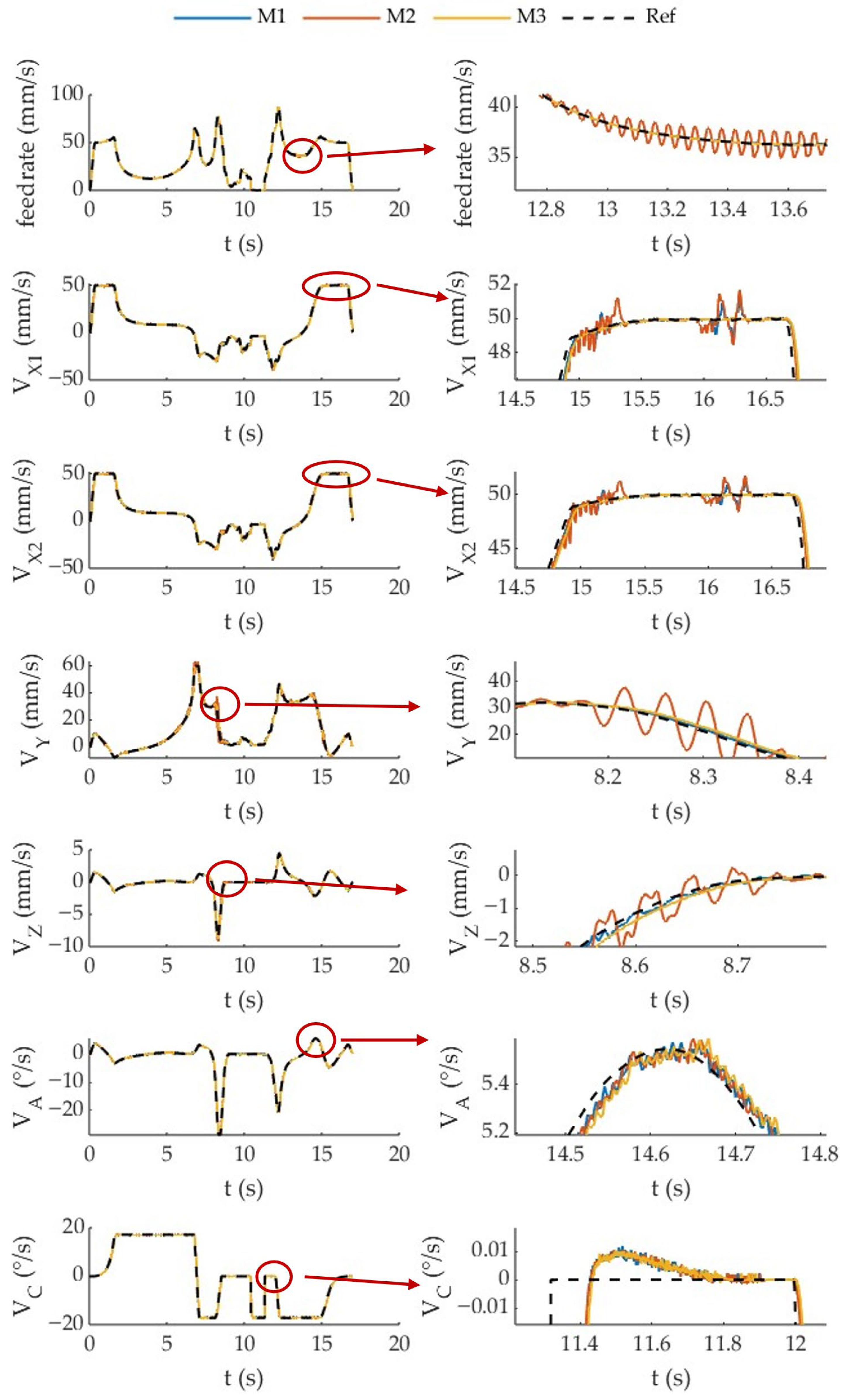 Figure 6 presents the planned feedrate profiles and the corresponding axis velocity responses obtained from the experimental five-axis platform. For each axis, both the commanded (set) velocity and the actual measured (act) velocity are displayed, based on real-time data acquisition from the servo drives. The figure allows for a comparative analysis of system behavior under different control strategies. It can be observed that when using the conventional feedback control method (M3) based solely on PID, the axis velocities remain relatively smooth. In contrast, the application of the MPC-based method (M2) introduces noticeable velocity fluctuations, particularly along the X, Y and Z axes, as a result of the model-driven optimization reacting to servo mismatches. When employing the proposed method (M1), which incorporates an interpolation-based approximation of the actual toolpath and integrates axis-wise velocity deviations into the contour error model, the velocity fluctuations are significantly mitigated.