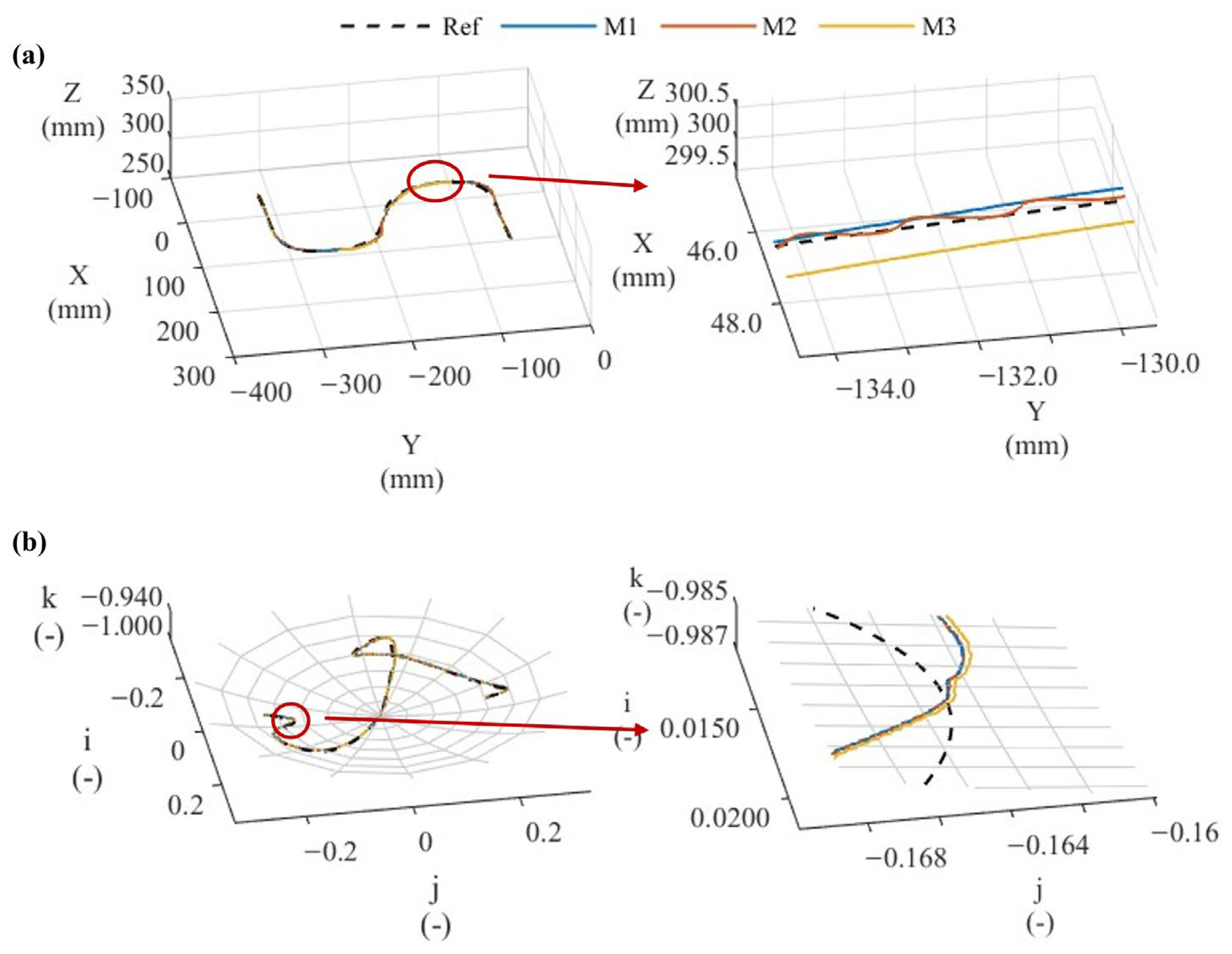 Table 2 provide experimental validation, while the required feedrate is set to 100 mm/s. A critical analysis confirms that M1 significantly outperforms M2 in terms of contour error precision for both tool tip toolpath tracking and tool orientation control. Specifically, M1 reduces the average tool tip point contour error (TTPCE) by 23.2% and by 22.0% for average tool orientation contour error (TOCE), relative to M3. Compared with M2, M1 provides an additional improvement of around 5% in both categories. Furthermore, maximum contour error demonstrates substantial improvements: TTPCE is reduced by around 16% compared with M2 and by approximately 27% compared with M3, while TOCE decreases by around 36% and 50%, respectively.