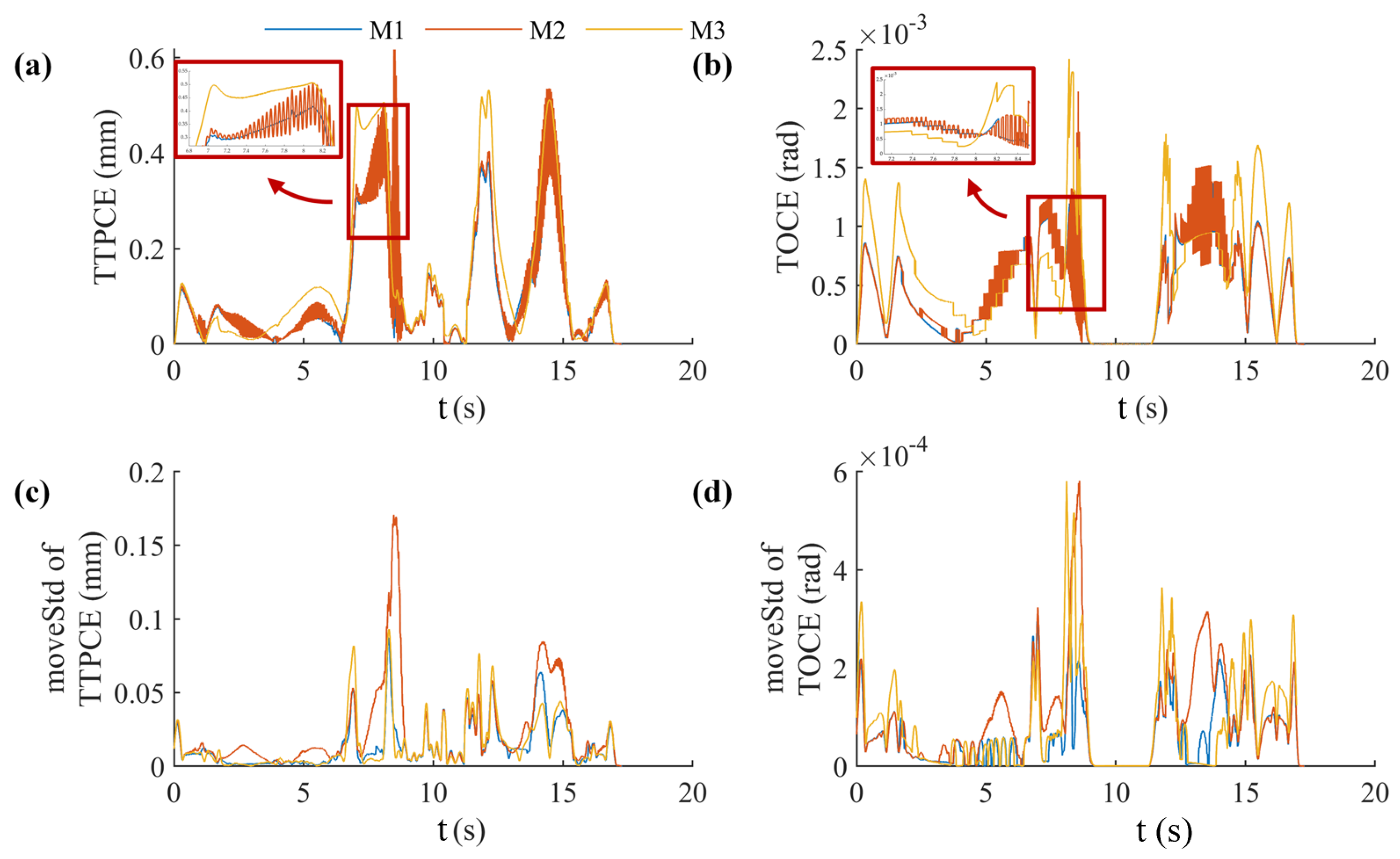 Table 1 (specifically the ‘max moveStd’ and ‘mean moveStd’ entries), the experimental results demonstrate that the proposed method substantially reduces contour error fluctuations relative to M2. The maximum and mean running standard deviations for tool tip point contour error (TTPCE) and tool orientation contour error (TOCE) are markedly lower, registering at only 36.6% and 46.6%, respectively, of M2’s values. These results confirm the effectiveness of the method in reducing actual toolpath oscillation during contour control and improving the accuracy of the final machining contour.