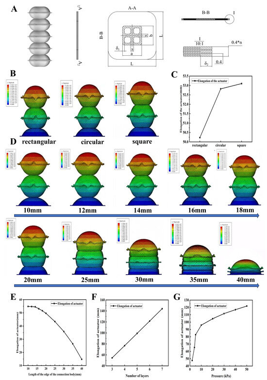 The design and simulation optimization of the thin-film elongation actuators. (A) The design diagram of the thin-film elongation actuator. (B) The simulation cloud diagrams of different connector shapes. (C) The relationship between connector shapes and elongations. (D) The simulation cloud diagrams of different side sizes. (E) The connector edge length–elongation relationship curves. (F) The relationship curve between the number of layers and the elongation amount. (G) The relationship curve between air pressure and the elongation amount.