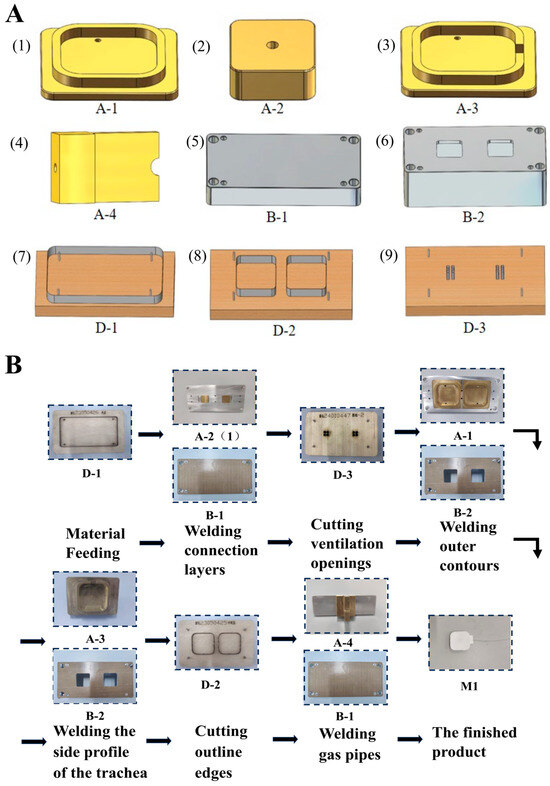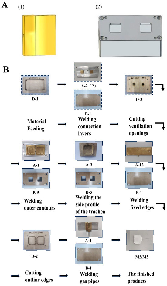 The planning and manufacturing process of the thin-film deflection actuators. (A) The manufacturing molds for the deflection modules: (1) the side-fixed welding mold; (2) the positioning hollow lower mold 2. (B) The manufacturing process of the thin-film deflection actuators.