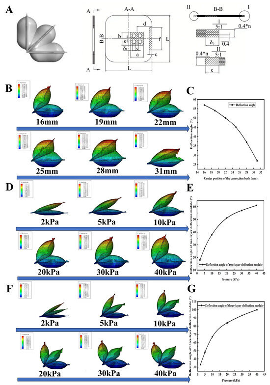 The design and simulation optimization of the thin-film deflection actuators. (A) The design diagram of the film-type deflection actuator. (B) The simulation cloud diagrams of the connector position. (C) The relationship curve between connector position and deflection angle. (D) The simulation cloud diagrams of the two-layer deflection module with variations in air pressure. (E) The relationship between air pressure and deflection angle for the two-layer deflection module. (F) The simulation cloud diagrams of the three-layer deflection module with variations in air pressure. (G) The relationship between air pressure and deflection angle for the three-layer deflection module.