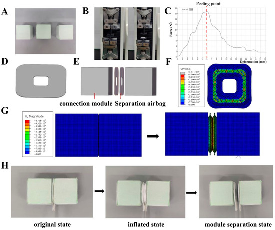 The design of the connection and disconnection modules. (A) The connection module. (B) The Velcro tensile experiment. (C) The tensile curve. (D) The single-layer airbag model. (E) The exploded diagram of the assembly method. (F) The stress diagram of the contact surface of the inflated separation airbag. (G) The simulation cloud diagrams of expansion separation. (H) The connection module segmentation experiment.