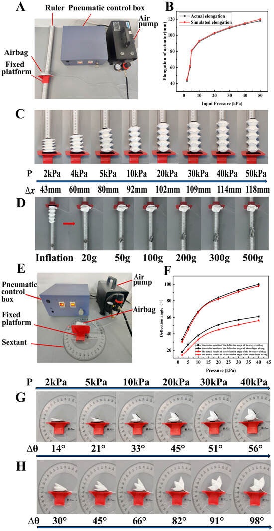 This article focuses on performance testing aimed at evaluating whether the actual elongation of actuator modules aligns with the simulation trends. A simple elongation testing platform was constructed, as shown in Figure 6A. This platform consists of the following components: (1) a fixed platform with a contact surface fitted with Velcro to adhere and secure the thin-film elongation actuator, simulating the primary fixation method during operational processes; (2) a measuring instrument—a ruler; (3) a pneumatic control box to control and adjust the input air pressure; and (4) an air pump to provide the air source. During the experiment, the input air pressure for the elongation actuator was sequentially increased from 2 kPa to 50 kPa (as shown in Figure 6C), recording its elongation. This process was repeated ten times to obtain an average value, with the standard deviation of the measured data approximately 1 mm. From the experiment and the measured data, it can be observed that, during pressurization expansion, the multilayer airbags of the thin-film elongation actuator expand almost synchronously, and the elongation increases with the rising air pressure. When the input air pressure is below 10 kPa, the rate of elongation growth is relatively high; however, when the air pressure exceeds 30 kPa, the growth rate of elongation decreases significantly. Ultimately, when the input air pressure increases to 50 kPa, the elongation of the thin-film actuator reaches 118 mm, approximately 59 times its original length. Through empirical comparisons, it can be seen that the actual state of the thin-film elongation actuator under different input air pressures maintains general consistency with the simulation results in terms of expansion trend, expansion shape, and changes in elongation (see Figure 6B). Subsequently, by positioning the actuator’s motion direction perpendicular to the direction of gravity with a flat support at the bottom, the load capacity during negative pressure contraction was tested. The negative pressure vacuum pump was operated in parallel with the positive pressure pump, where, after inflating to 50 kPa, a pressure of −30 kPa was applied. In this operational environment, the thin-film elongation actuator was able to drag a 500 g weight and successfully contract back to its original position (see Figure 6D). Upon calculation, the maximum output force can be roughly estimated to be 5 N, the specific force is about 25 N/kg, and the actuator’s own weight is about 200 g.