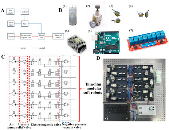According to the pneumatic control principles described above, the hardware required for each complete pressure control air circuit (shown in Figure 7B) includes two micro-air pumps, one precision pressure regulating valve, two two-position two-way solenoid valves, and two two-position three-way solenoid valves. This air circuit configuration allows for positive pressure driving and negative pressure restoration of the thin-film modular soft robot actuators. Additionally, the hardware for the control circuit includes a DC power supply, a microcontroller board, and relays.