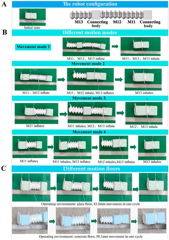 The peristaltic soft robot experiments. (A) The robot configuration. (B) Different motion modes. (C) Different motion floors.