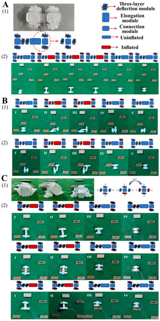 The experiments related to the planar crawling soft robot. (A) The planar crawling soft robot experiments: (1) the module combination approach; (2) the straightforward motion steps. (B) The deflection and obstacle avoidance motion process of the planar crawling soft robot: (1) right turning motion; (2) left turning motion. (C) The obstacle-crossing process: (1) motion modal transformation; (2) the flowchart of the obstacle-crossing motion.