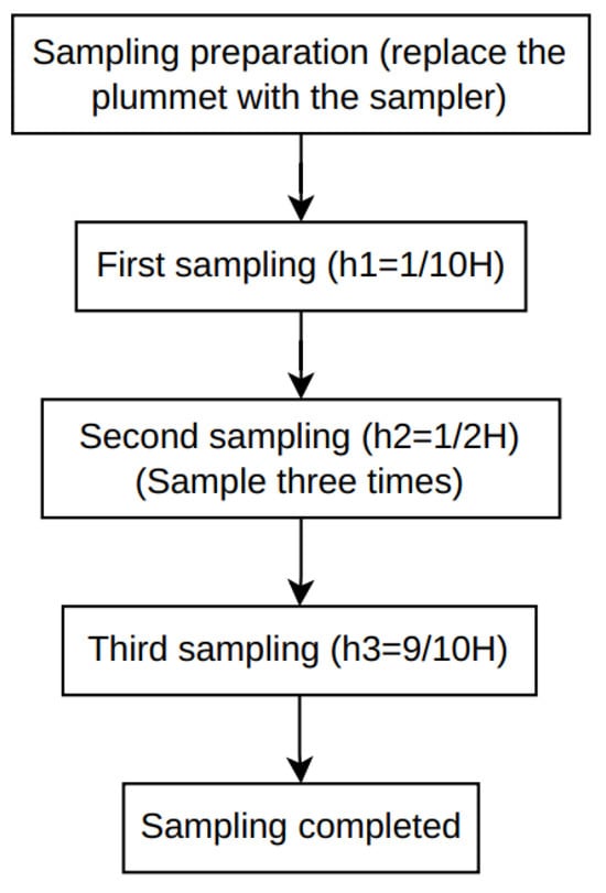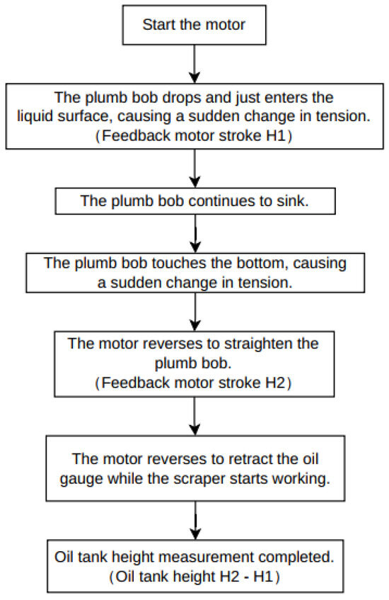 After successfully obtaining the height above the liquid surface (H1) and the distance from the tank opening to the oil sludge surface (H2) based on the precise calculation formulas mentioned above, the accurate oil level height (H) inside the tank can be further determined. This height data plays a crucial guiding role in the subsequent oil sampling operations. According to the sampling standards for animal and vegetable oils specified in GB/T 5524-2008 and ISO 5555:2001 [28], the “top” sample should be collected at one-tenth of the total depth, the “middle” sample at one-half of the total depth, and the “bottom” sample at nine-tenths of the total depth. Additionally, the “middle” sampling position requires three samples to be taken. In the actual operation process, the intelligent control program precisely drives the motor to move the sampling bucket, which is closely connected to the measuring tape, smoothly to the designated heights h1, h2, and h3 for sampling. Once the sampling bucket reaches the preset height, it remains stationary for 5 s to ensure that the sampling process is sufficient and complete, allowing representative oil samples to be accurately collected from each layer. After sampling is completed, the motor immediately reverses to orderly lift the sampling bucket, thus successfully completing the entire sampling process. The oil sampling flowchart is shown in Figure 9.