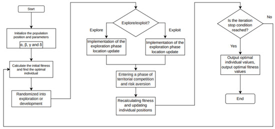 Based on the social habits of coati populations, Dehghani [30] proposed the Coati Optimization Algorithm (COA), a novel bio-inspired intelligent optimization algorithm. The algorithm is inspired by the foraging behavior and territorial competition mechanism of coatis. The core idea of the COA is to simulate coatis’ behaviors during the two main phases of exploration and exploitation, including foraging, territory marking, and antagonistic interactions, to achieve a balance between global search and local fine-tuning. These characteristics closely resemble the process of solving global optimization problems. Therefore, the COA can be effectively applied to various optimization tasks such as parameter tuning, path planning, neural network training, and control system optimization. The complete implementation flow of the COA is illustrated in Figure 11.