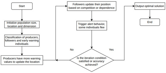 In summary, the Sparrow Search Algorithm (SSA) possesses strong local search capabilities and is easy to implement due to its relatively few parameters. However, when solving complex problems, it is prone to falling into local optima and lacks robust global search ability. The implementation process of the SSA is shown in Figure 12.