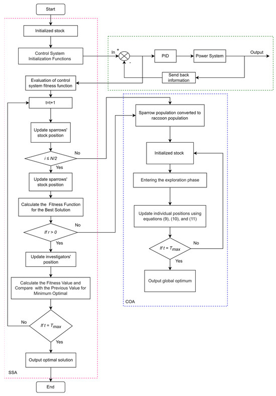 The improved Sparrow Search Algorithm (CSSA) operates through two stages: first, the Coati Optimization Algorithm (COA) is employed to perform global search, identifying promising regions within the solution space that exhibit high potential; then, the Sparrow Search Algorithm (SSA) is used to fine-tune and optimize within these regions to find the final optimal solution. This algorithmic model enables fast and efficient resolution of complex optimization problems. The detailed flowchart of the algorithm is shown in Figure 13.