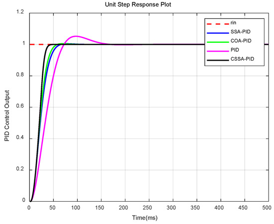 This study verifies the CSSA from two dimensions. The first dimension evaluates the algorithm’s iterative convergence speed, while the second assesses the response time and overshoot when a step signal is applied to the algorithm’s input. These results are compared with those of traditional PID, COA-PID, and SSA-PID controllers. To validate the effectiveness of the CSSA, the control system of the oil sampling machine is approximated as a second-order system, and its closed-loop transfer function is simplified as follows: