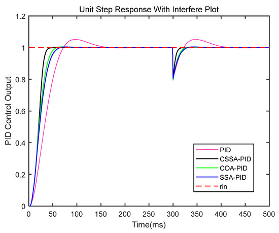 Figure 14 shows the step response experiment of the PID controller. As illustrated in the figure, the overall performance of the CSSA-PID algorithm significantly surpasses that of the SSA-PID, COA-PID, and traditional PID algorithms. Additionally, Table 3 provides a more systematic statistical comparison of key performance indicators such as overshoot and response time. Compared to the traditional PID controller, the CSSA-PID achieves up to a 72.3% improvement in response time and exhibits zero overshoot, whereas all other controllers show some degree of overshoot. The results from both the step response and disturbance rejection experiments demonstrate that the CSSA-PID possesses superior global optimization capability. It effectively suppresses servo motor oscillations during oil level measurement and sampling and also enhances the system’s response speed to a certain extent.