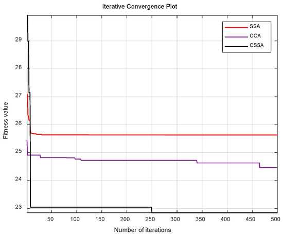 Table 2 presents the experimental parameters used to validate the optimization performance of the CSSA. A population size of 300 was chosen to ensure diversity across the entire search space, which not only accelerates the computation speed but also effectively guarantees global exploration. The maximum number of iterations was set to 500, based on preliminary testing, to ensure effective computation results while avoiding unnecessary computational overhead. For PID parameter selection (Kp, Ki, and Kd), the initial values were set to 3.5, 1.0, and 0.01, respectively, with upper bounds defined as [100, 10, 1] to accommodate the nonlinear characteristics of the oil sampling system. The search dimension was set to 3, corresponding to the three PID parameters. Regarding the Sparrow Search Algorithm, the producer ratio was set to 0.6, the alerter ratio to 0.2, and the safety threshold to 0.7, which helps balance the sparrow population’s exploration of the solution space.