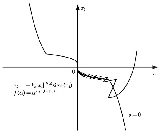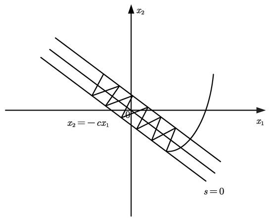 To further analyze the advantages of the proposed sliding mode surface as guided by [32,33], we theoretically examined its superiority. When the system moves onto the sliding mode surface, x1 and x2 will move along the sliding mode surface, and one can have , , , , and ; then, the sliding speed on the sliding mode surface will depend on x2. According to Equation (17), one can have