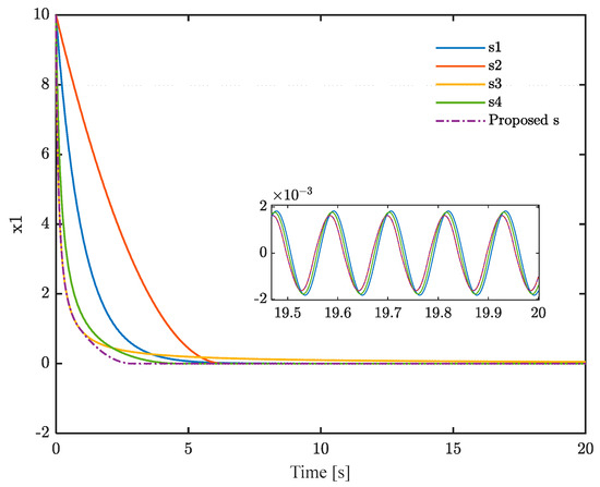 Then, according to Equations (18) and (19), it can be theoretically proven that the superiority of the proposed sliding mode surface holds true, whether x1 is greater than 1 or less than 1, as the proposed sliding mode surface exhibits a faster convergence rate in both cases.