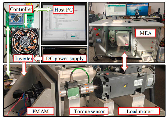 In this section, an experimental platform is established, and a surface-mounted PMAM is chosen as a prototype for control experiments to validate the effectiveness of the proposed algorithm. The experimental platform is depicted in Figure 5, while the PMAM data are summarized in Table 2. The inductance and resistance of the motor model are measured using an LCR meter. Flux linkage is identified through no-load back EMF measurement. The motor’s moment of inertia and viscous damping coefficient are tested using the method described in [35]. A diagram illustrating the proposed strategy is provided in Figure 6.