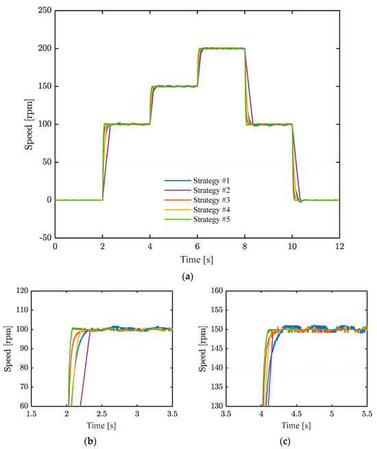 Speed waveforms of the five strategies under 200 rpm. (a) five strategies, (b) strategy #1, (c) strategy #2, (d) strategy #3, (e) strategy #4, (f) strategy #5.