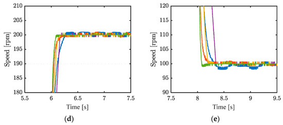 Speed response and local enlarged views. (a) 0–12 s, (b) 1.5–3.5 s, (c) 3.5–5.5 s, (d) 5.5–7.5 s, (e) 7.5–9.5 s.