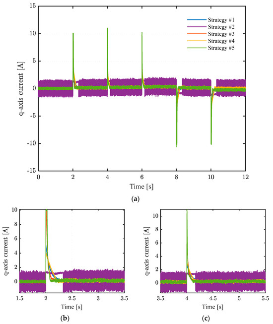 Figure 8 shows the current of the q-axis and local enlarged views. As can be seen, in a steady state, strategy #5 also has the smallest fluctuation.