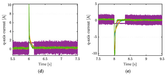 Currents of q-axis and local enlarged views. (a) 0–12 s, (b) 1.5–3.5 s, (c) 3.5–5.5 s, (d) 5.5–7.5 s, (e) 7.5–9.5 s.
