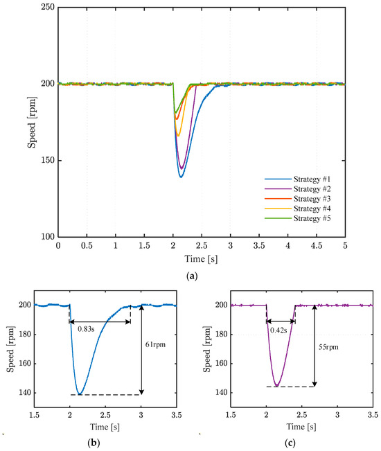 Figure 9 shows the speed of the five strategies under 200 rpm, and a 1 Nm load is applied at 2 s. Figure 10 shows the q-axis currents of the five strategies under 200 rpm. Strategy #5 has the smallest speed drop at 19 rpm and the fastest recovery time at 0.3 s. The speed drops of the five strategies are 61 rpm, 55 rpm, 23 rpm, 34 rpm, and 19 rpm, respectively. The ITAEs of the four strategies are 50.8, 31.18, 10.7, 12.6, and 6.9, respectively. Strategy #1, using PI control, has the longest recovery time of approximately 0.83 s. The speed drop in strategy #2, which uses the traditional sliding mode control, is slightly smaller than that in strategy #1. The recovery time of strategy #2 is nearly 0.42 s. The speed drop in strategy #3 is slightly smaller than that in strategy #4, but its recovery time is nearly twice that of strategy #4. This is because the linear term provides higher gain when the speed tracking error is large compared to the terminal term, while it performs worse than the terminal term when the error is small. This is in line with the asymptotic convergence characteristic of the linear sliding mode surface and the finite-time convergence characteristic of the terminal sliding mode surface. Regardless of steady-state fluctuations, dynamic disturbance rejection, speed drop, or recovery time, the proposed strategy #5 shows the best performance. In terms of complexity, the proposed strategy, due to the incorporation of a switching mechanism, does not significantly increase the complexity compared to strategies #1–#4, demonstrating good performance.