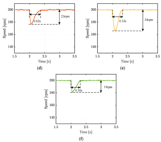 Figure 7 shows the speed response and local enlarged views. Starting from 2 s, the reference speed is set to 100 rpm, 150 rpm at 4 s, 200 rpm at 6 s, 100 rpm at 8 s, and 0 rpm at 10 s.