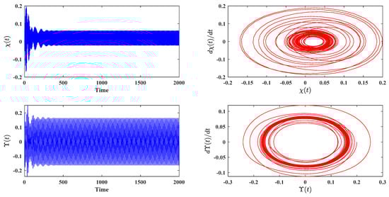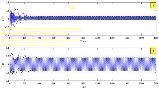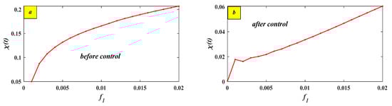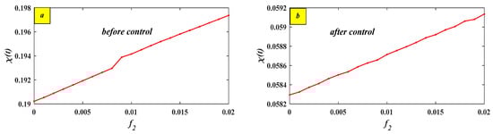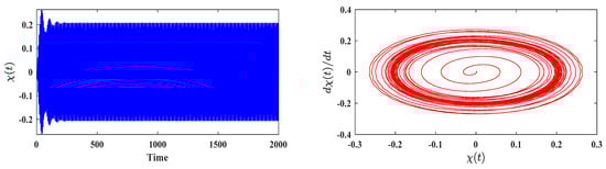 Figure 15 shows the system’s external excitation force increased. Although the amplitude  is increased before the addition of the NSC, the effect is not evident at this time due to the tiny values, as illustrated in Figure 15a, because  has an amplitude between 0 and 0.2. When the NSC controller is added, as shown in Figure 15b, the system’s amplitude decreases, and the amplitude of  falls between 0 and 0.06. As a result, we concluded that the NSC controller effectively reduces the external excitation force. Additionally, the van der Pol motion is described in Figure 16 by increasing the external excitation force. Although the amplitude  is increased before the addition of the NSC, the effect is not evident at this time due to the tiny values, as illustrated in Figure 16a, because  has an amplitude between 0 and 0.198. When the NSC controller is added, as seen in Figure 16b, the system’s amplitude decreases, and the amplitude of  falls between 0 and 0.0592. As a result, we concluded that the NSC controller effectively reduces the external excitation force.