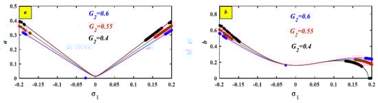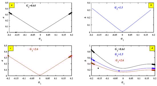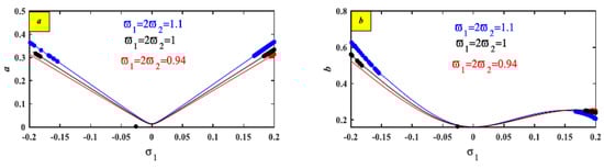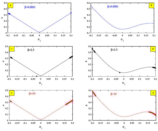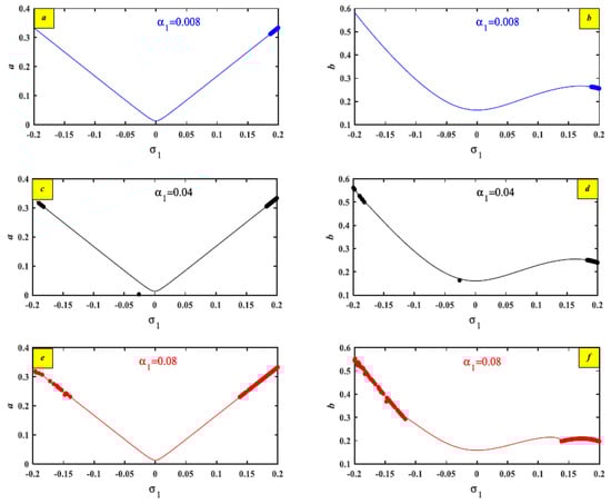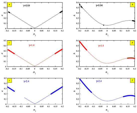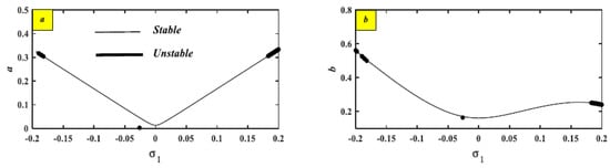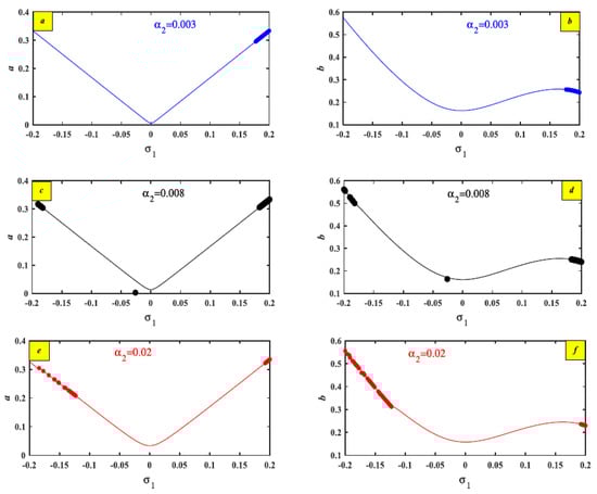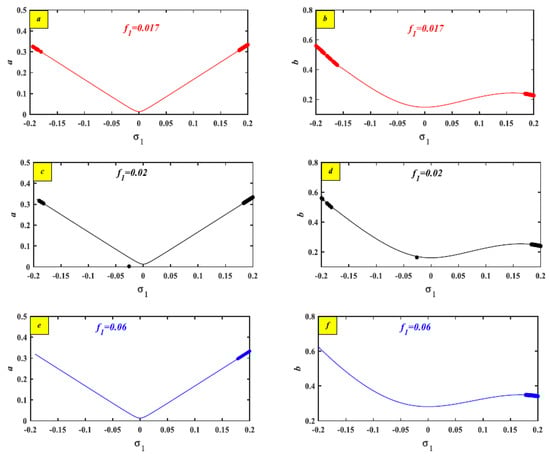 This section examined the steady situation amplitude in the case of 1:2 resonance with respect to the regulated system. We have numerically solved the FREs (28) and (29) using the identical values for the parameters. The results are shown graphically as the steady scenario amplitude a for the system and the NSC controller b against the detuning setting. Following the addition of the NSC, the outputs are shown in Figure 4 as steady scenario amplitudes a and b against the detuning. As shown in Table 1, three representative values were all allocated to each system parameter to examine how they affected the dynamic response. The force amplitude  increased, causing the unstable region to diminish in both system and NSC amplitudes, as shown in Figure 5. As Figure 5a–c illustrate, the system remains unchanged as the force develops. As the values of the damping coefficients ( and ) grew, the unstable zone expanded as shown in Figure 6 and Figure 7. Figure 8 demonstrates how increasing the control signal gain  values led to a decrease in the unstable region in the steady scenario amplitude for system a and an increase in the steady scenario for controller b. Figure 9 explains how the primary system’s unstable zone decreased as the control feedback  signal’s values increased. On the other hand, the controller’s steady-state amplitude is increased. Figure 10 demonstrates how the values of  increase the steady scenario amplitudes of the controller and the system. Figure 11, Figure 12 and Figure 13, in that order, illustrate that the unstable region increased by increasing the values of the nonlinear parameters , , and . In Figure 14, the steady scenario amplitude for the controller developed as the values of the detuning parameter  increased, but the steady scenario amplitude for the system shifted to the right.