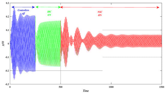 Figure 18 illustrates the response of the van der Pol–Mathieu–Duffing oscillator with and without control, using low-gain values. Initially, the system exhibits nonlinear oscillations without any control during the time interval . At , a conventional integral resonant controller (IRC) is applied and remains active until . Then, at , the IRC controller is deactivated and replaced immediately by the NSC controller, which continues to operate until . As observed in the figure, the IRC controller leads to a slight reduction in vibration amplitude during the interval . However, switching to the NSC controller at  results in a more effective suppression of the system’s vibrations.