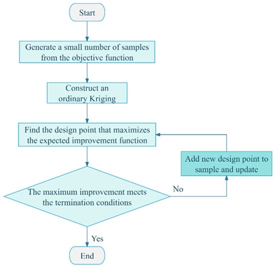 Building upon this foundation, the EGO was developed by Jones et al. [], which incorporates the Expected Improvement (EI) acquisition function to strategically guide a strategy of sample space refinement. Assuming obeys normal distribution; where is the kriging predictor; is the mean squared error (MSE); and is the current minimum, the EI at location is as follows: