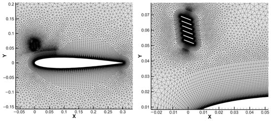 The computational domain was constructed using a C-type topology, extending about 20 chord lengths (c) upstream and to the far-field boundaries, and 30 chord lengths downstream to minimize boundary condition effects. A velocity-inlet boundary condition was applied at the far-field, with a specified freestream velocity and low-turbulence conditions (a turbulence intensity of 0.1% and turbulent viscosity ratio of 1). A pressure-outlet condition was set at the downstream boundary. A no-slip wall condition was applied to the airfoil and deflector surfaces.