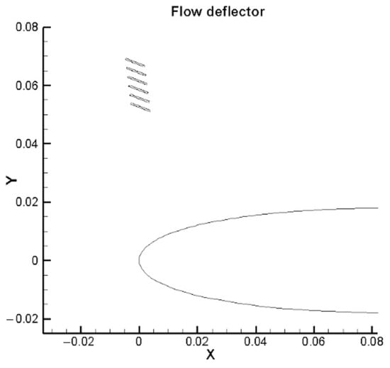 It can be noted that the optimal flow deflector configuration features = . For the sake of comparison, a reference deflector was constructed by modifying this parameter to = , as shown in Figure 18.